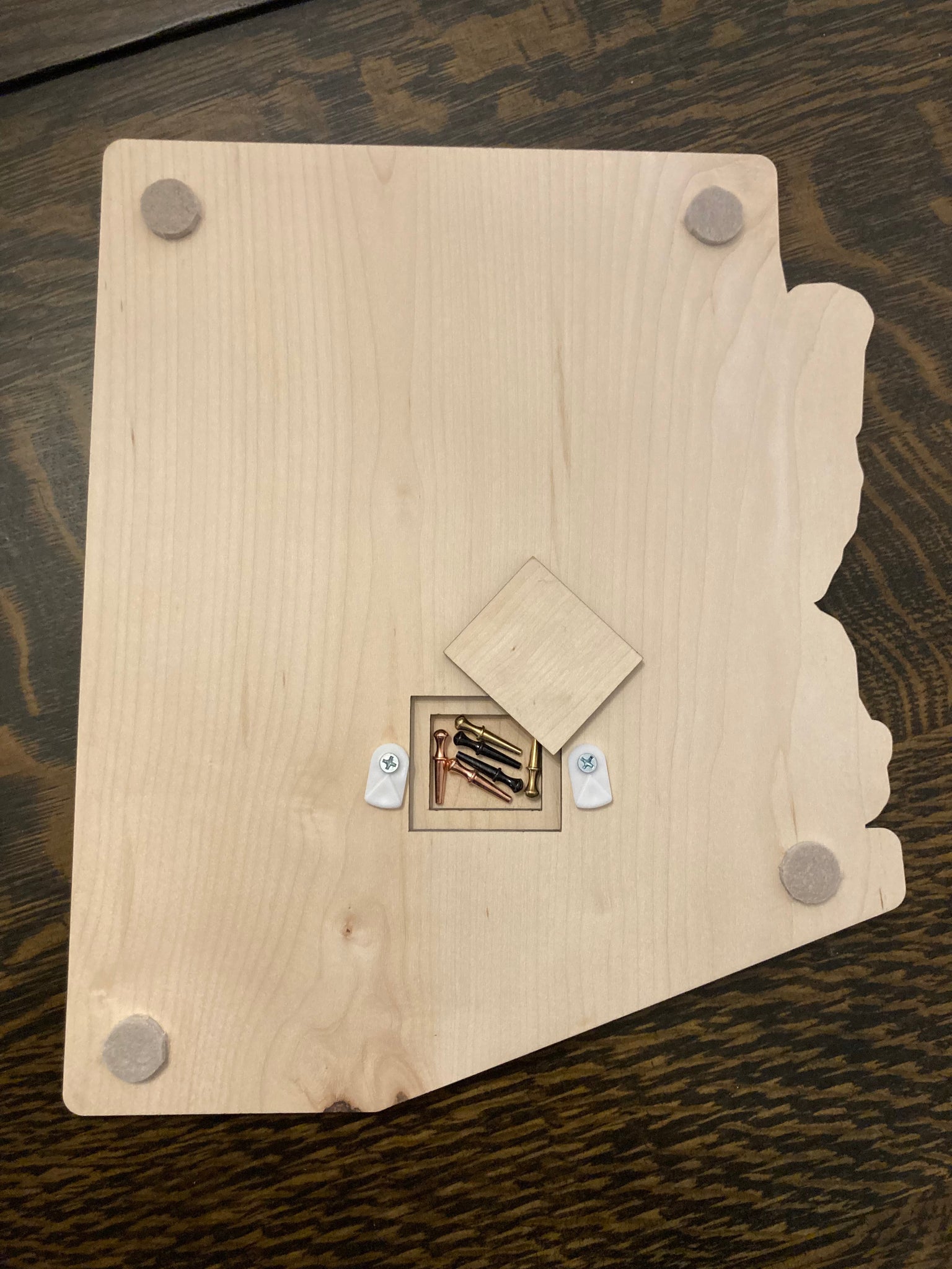 Outline of Arizona cribbage board. Center of board can be customized to an image or saying of your choice. Includes: 1 customized game board 3 sets of colored pegs 1 deck of cards.